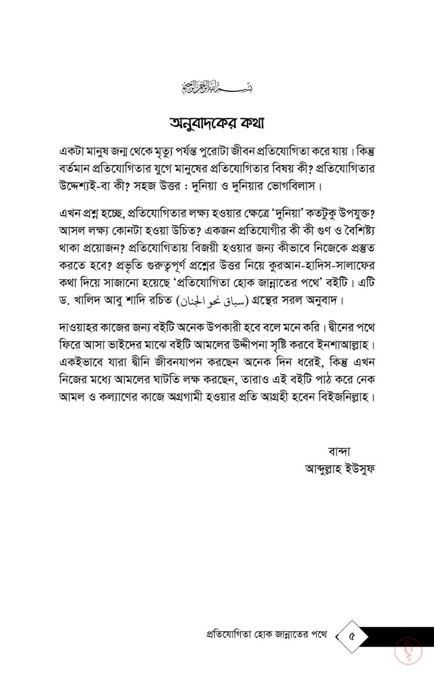 অনুবাদ: আব্দুল্লাহ ইউসুফবর্তমানের কোন মানুষটি প্রতিযোগিতায় লিপ্ত নয়!? সবার মাঝে চলছে প্রতিযোগিতা! কারও মাঝে প্রতিযোগিতা চলছে প্রকাশ্যে ঘটা করে। যেমন : ক্রীড়া প্রতিযোগিতা, গান প্রতিযোগিতা, নাচ প্রতিযোগিতা, এমনকি সুন্দরী প্রতিযোগিতার নামে নারীদেহকে নগ্ন করে উপস্থাপনের প্রতিযোগিতা!! আর কেউ প্রতিযোগিতায় লিপ্ত মঞ্চের বাইরে—যেখানে অবশ্য প্রতিযোগীদের মাঝে আনুষ্ঠানিক কোনো আয়োজন হয় না; বরং এ প্রতিযোগিতা চলে নীরবে—অন্যকে দেখে দেখে। এ প্রতিযোগিতা দুনিয়া উপার্জনের প্রতিযোগিতা : কীভাবে নিজের ক্যারিয়ার গঠন করা যায়!? বড় কোনো পদ-পদবি পাওয়া যায়!? কীভাবে লাখপতি-কোটিপতি হওয়া যায়—গাড়ি-বাড়ির মালিক বনা যায়!? হ্যাঁ, এমন অনেক অসুস্থ প্রতিযোগিতাই জেঁকে বসেছে আজকের অধিকাংশ মানুষের মন-মগজে। আমাদের মহান সালাফগণও প্রতিযোগিতা করতেন। কিন্তু কী ছিল তাঁদের প্রতিযোগিতা? কোন লক্ষ্যপানে তাঁরা ছুটে চলতেন? জানতে চাও? তাহলে তোমার দৃষ্টিকে নিবদ্ধ করো এ বইটির পাতায় পাতায়…